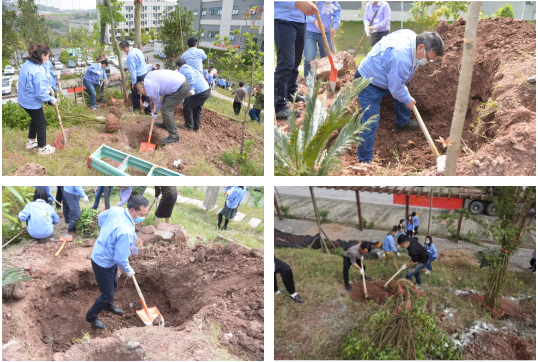植樹現(xiàn)場(chǎng),大家揮動(dòng)鐵鍬鏟土、培土,用腳踩實(shí)壓緊,個(gè)個(gè)干勁十足,以飽滿的熱情投入到播種綠色的行動(dòng)中。經(jīng)過(guò)2個(gè)多小時(shí)的努力,50余棵樹及二萬(wàn)株樹苗昂然挺立。一棵一棵樹苗象征著一份份綠色的希望;一滴滴汗水的揮灑,更代表著建設(shè)“美麗翰博花園”的決心。