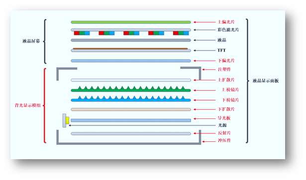 背光顯示模組,又稱背光源,是由LED光源、導(dǎo)光板、擴(kuò)散片、棱鏡片、反射片等光學(xué)材料以及精密結(jié)構(gòu)件構(gòu)成,其工作原理為:光源射出的光線經(jīng)過導(dǎo)光板內(nèi)部光學(xué)結(jié)構(gòu)的引導(dǎo)轉(zhuǎn)換為面光源,隨后通過一系列光學(xué)過程,最終形成適合人眼觀感的光源效果。因此,背光顯示模組直接決定了液晶顯示面板的顯示效果。